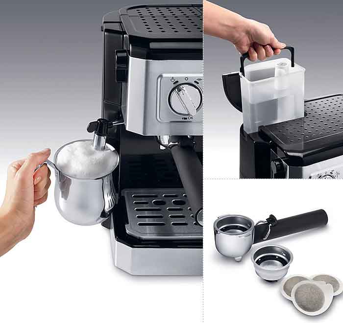 اسپرسوساز دلونگی مدل BCO431 دارای دو مخزن جداگانه برای تهیه قهوه فرانسه و کاپوچینو بصورت مجزا می باشد. قسمت راست دستگاه مخزن آب و قهوه تعبیه شده است که امکان تهیه 10 فنجان قهوه را فراهم می سازد و قسمت چپ آن مخزن دیگری جهت تهیه اسپرسو و کاپوچینو وجود دارد. برای تهیه کف شیر و آب جوش نیز می توانید از این اسپرسوساز دلونگی استفاده کنید. طراحی زیبای بدنه با ترکیبی از رنگ های مشکی و استیل، ظاهری زیبا به آن بخشیده است. نمایندگی دلونگی قیمت اسپرسوساز دلونگی